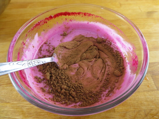 În primul vas se adaugă o lingură de cacao şi apoi pe rând câte o linguriţă din piureul de sfeclă, până când culoarea se închide şi compoziţia devine de consistenţa unei smântâni groase.