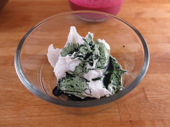 În cel de-al doilea vas se adaugă pe rând câteva linguri de clorofilă lichidă şi o linguriţă de oţet, şi se amestecă până când culoarea se omogenizează şi se ajunge la consistenţa dorită.