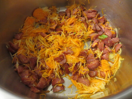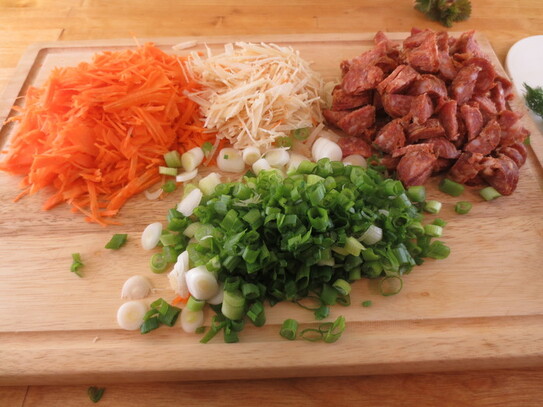 Morcovul şi pătrunjelul/ ţelina se dau pe o răzătoare fină, iar ceapa şi usturoiul verde se taie mărunt. Cârnatul se curăţă de pieliţă şi se taie în rondele fine, care la rândul lor se mai pot mărunţi dacă doriţi. Dacă folosiţi şuncă, aceasta se taie în cubuleţe.