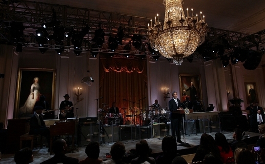 Barack Obama vorbeşte la evenimentul „În concert la Casa Albă: roşu, alb şi blues”, 21 febr 2012, Washington DC. (Win McNamee / Getty Images)