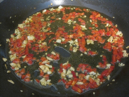 Se adaugă usturoiul, ghimbirul şi ardeiul mărunţit, amestecând uşor până când ardeiul îşi schimbă uşor culoarea.
