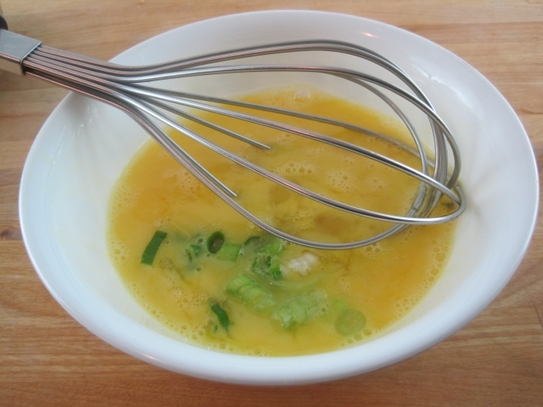Ouăle se bat cu un tel, până când albuşul şi gălbenuşul sunt amestecate bine, apoi se adaugă puţină sare şi câteva rondele de ceapă verde.