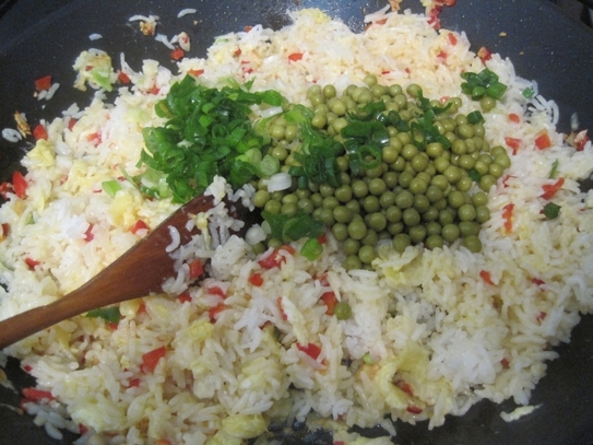 Se adaugă apoi orezul amestecând continuu, având grijă ca boabele să se separe şi să fie învelite în ou. Se adaugă apoi mazărea şi restul de ceapă verde. Se sărează şi se condimentează cu piper după gust.