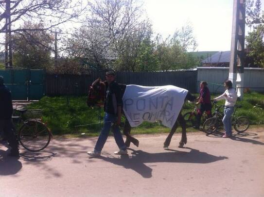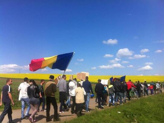 După un protest în faţa primăriei din Băceşti, coloană de manifestanţi a ajuns pe înnoptate, după nouă kilometri de marş, în Păltiniş, cea de a doua localitate vizată de Chevron, unde protestatarii au fost aşteptaţi cu colaci făcuţi în casă de gospodine şi cu ceai cald.
