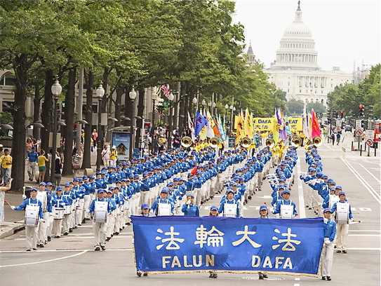 Pennsylvania Avenue a prins viaţă când participanţii, rând pe rând, conduşi de Formaţia Marşului Celest în uniforme albastre, au defilat prin centrul Washingtonului purtând bannere, steaguri şi pancarte. În cadrul paradei, un grup de femei îmbrăcate în rochii albe purtau fotografii al căror contur era înconjurat cu flori - portretele îi înfăţişau pe unuii dintre cei peste 3.400 de practicanţi Falun Gong ucişi de regimul comunist din China.