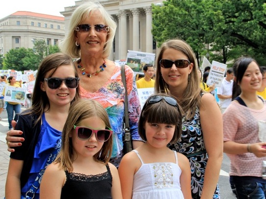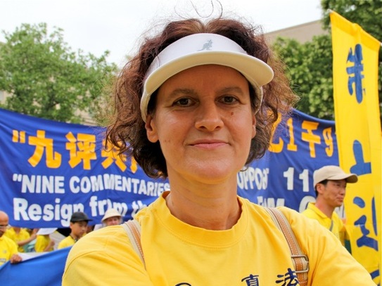 Ţinând unul dintre bannere, Birgit Braun a spus că a călătorit din Germania la Washington ştiind că acasă îşi poate exprima credinţa în deplină libertate, însă în China oamenii nu pot face acest lucru.