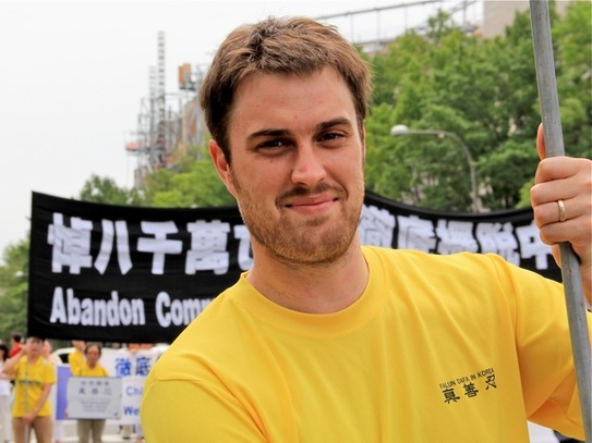Dillon Spitler, un american care lucrează în Coreea de Sud, a participat la paradă ca parte a grupului de 30 de practicanţi Falun Gong din Coreea de Sud.