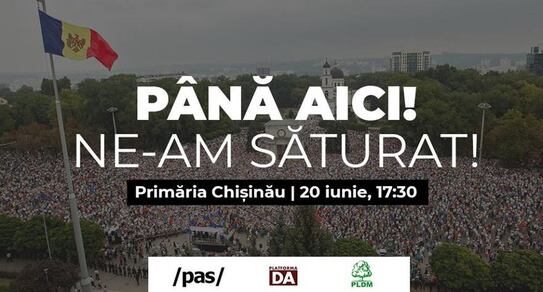 În contextul invalidării mandatului de primar general al municipiului Chişinău pentru Andrei Năstase, miercuri, 20 iunie, începând cu ora 17:30 în faţa Primăriei va avea loc o acţiune de protest cu genericul ”Până aici! Ne-am săturat! Ieşim la protest să ne apărăm votul!”