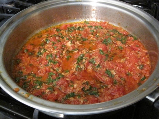 Când sosul începe să fiarbă, se reduce flacăra la foc mic şi se adaugă peştele, şi caperele. Se lasă încă vreo 5 minute, amestecând ocazional. La sfârşit se adaugă pătrunjelul verde tocat mărunt.