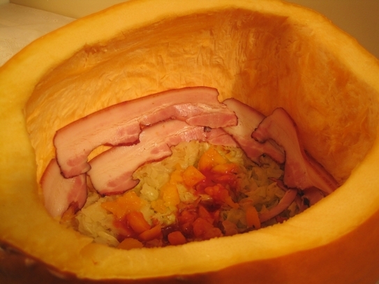 - Clădiţi sarmalele în dovleac, în straturi succesive, intercalate pe alocuri cu roşii tocate şi felii de slăninuţă pe margine. (dacă vreţi să scurtaţi timpul de gătire la cuptor, puteţi fierbe dinainte sarmalele, aşa cam o oră).
