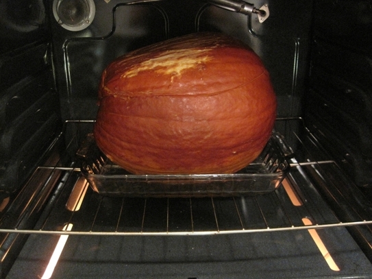 - Introduceţi dovleacul în oala de lut şi pe aceasta la cuptorul încins la foc potrivit (180 grade Celsius).