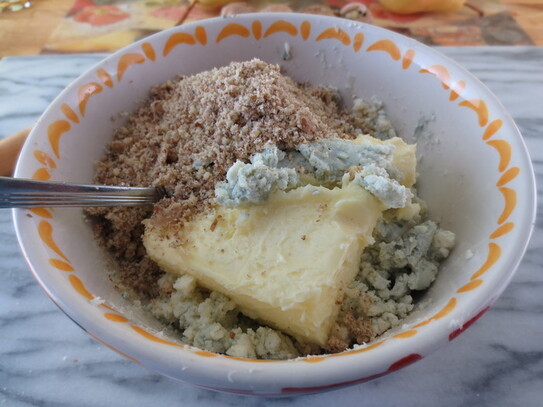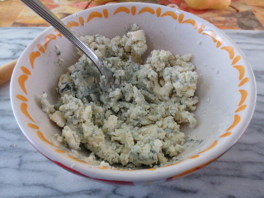 Brânza se pune într-un castron de mărime potrivită, iar cu ajutorul unei furculiţe, se fărâmiţează bine de tot. Se adaugă untul ţinut la temperatura camerei şi puţin piper. Se amestecă bine cu o spatulă până când se obţine o pastă omogenă. Opţional se poate adăuga şi un păhărel de coniac.