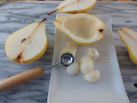 Perele se taie pe lungime, iar apoi cu ajutorul unui dispozitiv de scobire, se îndepărtează cotorul cu seminţe. Pulpa de jur împrejurul cotorului se scobeşte în continuare şi se pune deoparte într-un castronaş. Atât pulpa, cât şi jumătăţile de pară se stropesc cu zeamă de lămâie, pentru a evita oxidarea.