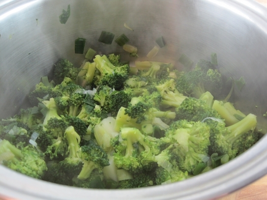 Separat, spălaţi bine căpăţâna de broccoli, apoi tăiaţi părţile florale în părţi mai mici, cât mai egale. Cotoarele mai fragede se pot folosi şi ele, având însă grijă să le curăţaţi de pieliţa, care este aţoasă. Ceapa se spală, se curăţă şi apoi se taie în rondele.