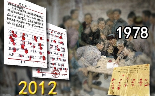 În 1978, 18 săteni din Xiaogang, în estul provinciei Anhui, şi-au riscat vieţile pentru a semna un acord secret, prin care împărţeau oamenilor din comuna lor terenurile agricole, în parcele ce puteau fi cultivate de fiecare familie în parte. Pactul lor este considerat începutul perioadei de creştere economică rapidă şi de industrializare, pe care China le-a experimentat în cei treizeci de ani de atunci încoace. Documentul istoric imprimat cu amprentele roşii ale sătenilor se află în Muzeul Naţional din China. Petiţionarii din satul Zhouguantun au folosit şi ei ceară roşie pentru a amprenta petiţia.