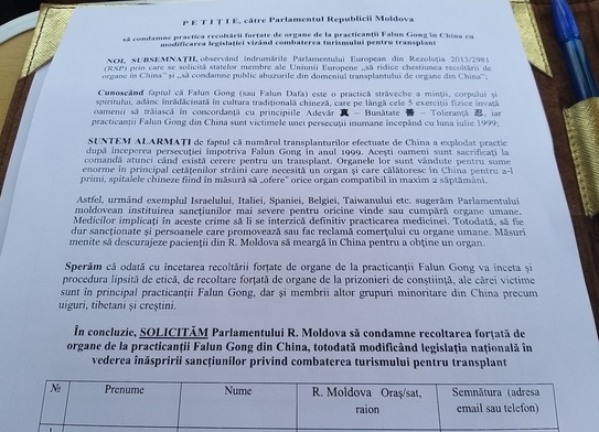 Petiţia activiştilor Falun Gong moldoveni se bazează pe îndrumările Parlamentului European din Rezoluţia 2013/2981 (RSP) prin care se solicită statelor membre ale UE „să ridice problema recoltării de organe în China” şi „să condamne public abuzurile din domeniul transplantului de organe din China”.