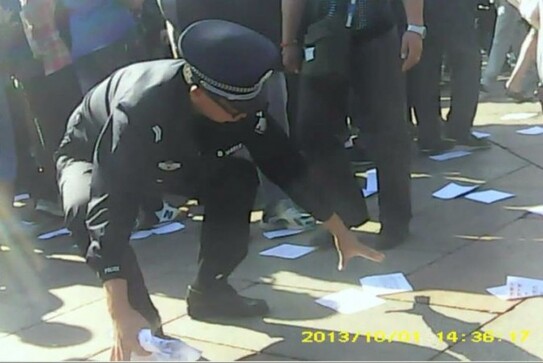 Gu Guoping, un activist pentru drepturile omului ce lucrează în Shanghai, a relatat ziarului Epoch Times ce a văzut în piaţă: “În doar o oră şi jumătate, de la 16 la 17:30, în 1 octombrie, am văzut 4 valuri de petiţionari. Oamenii au distribuit pliante şi au strigat slogane în Piaţa Tiananmen. Aproximativ 2.000 până la 3.000 de pliante au fost distribuite.”