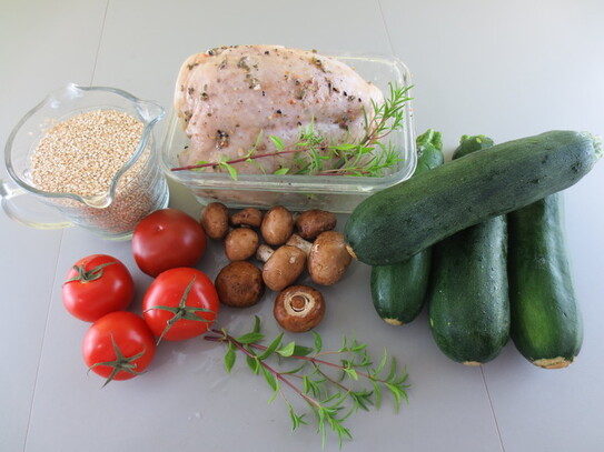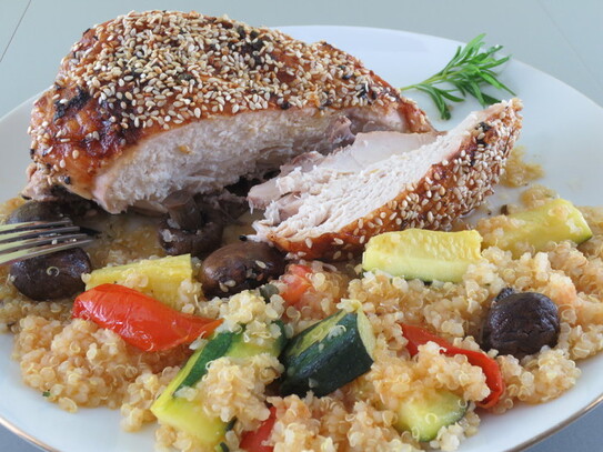 Piept de pui la cuptor cu seminţe de susan - servit cu garnitură de dovlecei cu roşii şi quinoa