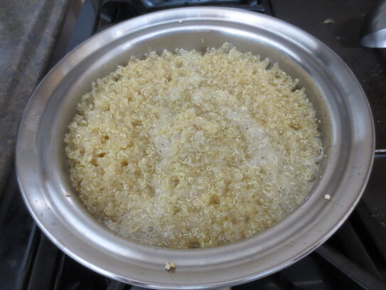 Quinoa se pune într-o sită măruntă şi spală bine sub jet de apă călduţă, pentru a se elimina substanţa de deasupra care poate dă un gust uşor de amăreală. Se pune la fiert într-o oală în care se adaugă 3 căni de apă şi puţină sare şi se fierbe 10 minute. Se ia de pe foc şi se lasă deoparte. Quinoa va absorbi apa rămasă. Dacă nu aveţi la îndemâna quinoa se poate folosi orez fiert.
