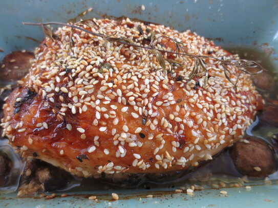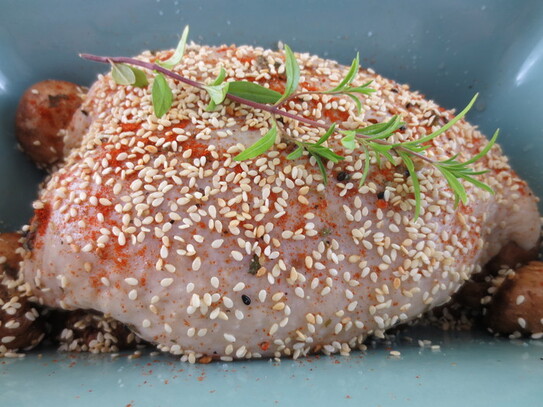 Înainte de preparare, carnea se scoate din frigider şi se lasă să ajungă la temperatura camerei. Se scoate din baiţ, apoi se presară cu paprică, sare, piper şi seminţe de susan.