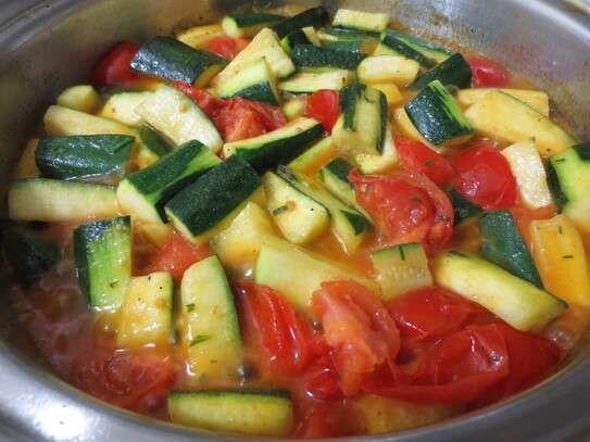Într-o tigaie mai mare, se pun 3 linguri de ulei, apoi se adaugă bucăţile de dovlecei, se presară cu puţină sare şi se gătesc cam 5 minute, după care se pun feliile de roşii şi cam jumătate din verdeaţa mărunţită. Se gătesc în continuare dar nu mai mult de 5 minute. Dovlecei îşi vor schimba culoarea, dar vor rămâne puţin crocanţi.