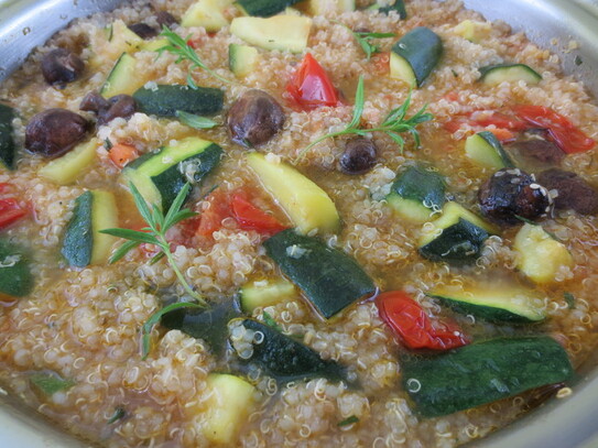 Mâncarea de dovlecei cu roşii şi orez e o reţetă de sezon destul de populară. Înlocuind orezul din reţeta tradiţională, cu quinoa, pe lângă beneficiile de sănătate pentru care quinoa este venerată, veţi reduce timpul de preparare substanţial, deoarece quinoa se fierbe în 10 minute.