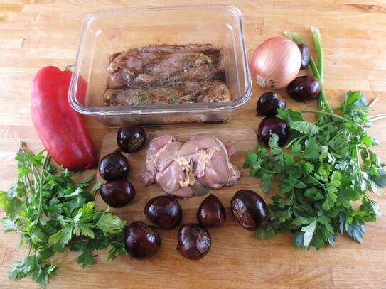 O treime de ardei se taie în cubuleţe, restul se taie în fâşii groase de un cm. Castanele se curăţă de coajă, apoi se taie în felii subţiri.