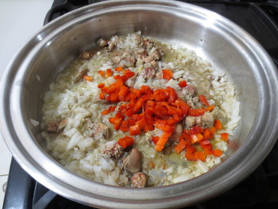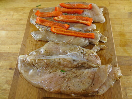 Se ia o jumătate de piept de pui, se sărează, după care se pun câteva felii de ardei roşu.