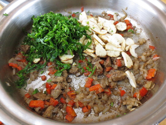 Se adaugă pesmetul şi feliile de castane, se amestecă cu ficatul apoi se adaugă măgheranul şi frunzele de pătrunjel.