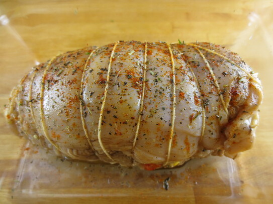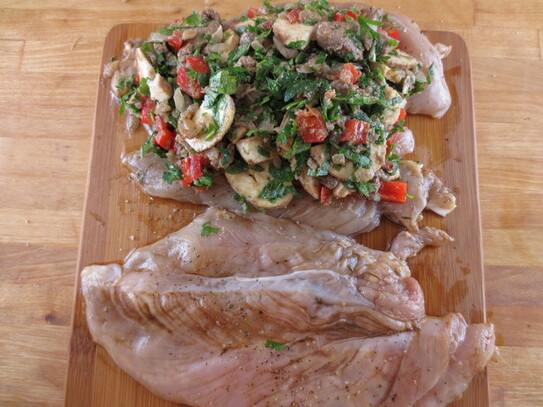 Umplutura se împarte în jumătate. Prima parte se întinde pe bucata de piept, deasupra feliilor de ardei. Peste umplutură se pun din nou câteva felii de ardei, şi apoi o altă bucată de pui. Carnea se leagă cu sfoară şi se unge cu puţin ulei, după care se presară cu sare, piper, paprică şi măghiran. Se procedează la fel cu celelalte două bucăţi de carne rămase.