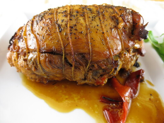 Pieptul se scoate din cuptor şi se lasă să stea câteva minute, apoi se stropeşte cu sosul propriu şi se serveşte alături de garnitura preferată.