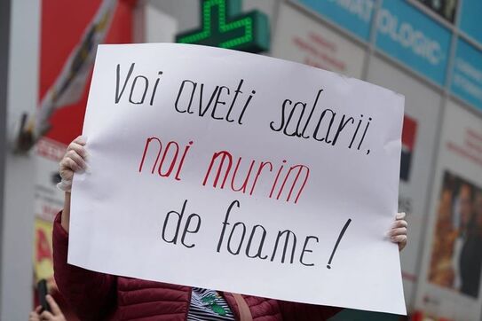 Protestatarii din Chişinău au purtat pancarte şi au scandat mesajele: „Vrem să lucrăm!”, „Voi aveţi salarii, noi murim de foame!”, „Lăsaţi-ne să muncim, copiii cer mâncare!”.