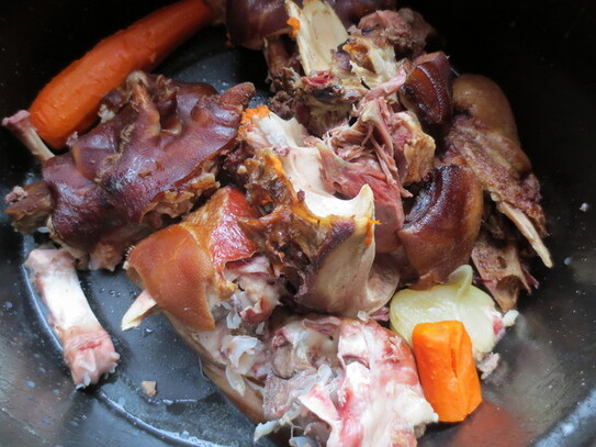 Picioarele şi capul de porc se trec mai întâi prin flacără, pentru a arde eventualele fire de păr rămase de la tăierea porcului. Se înlătură unghiile, se taie în bucăţi, se spală bine în mai multe ape, apoi se opăresc.