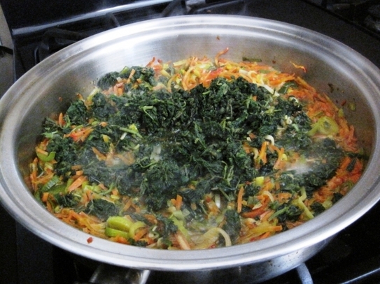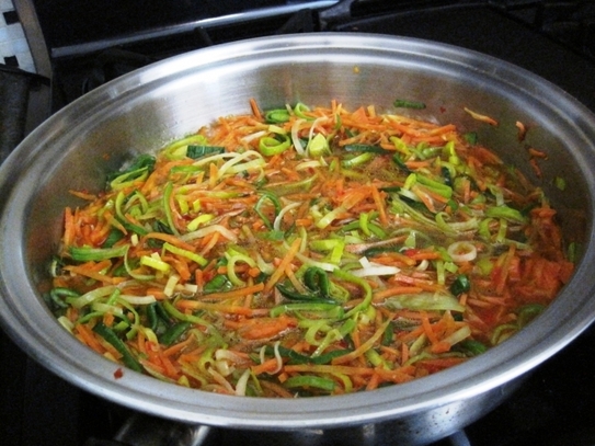 Prazul se taie în rondele subţiri, şi se spală bine, pentru a îndepărta eventualele fire de nisip ascunse printre frunze; se căleşte în ulei, se adaugă morcovul ras şi ardeiul tăiat în cubuleţe, apoi urzicile şi se mai călesc împreună câteva minute.