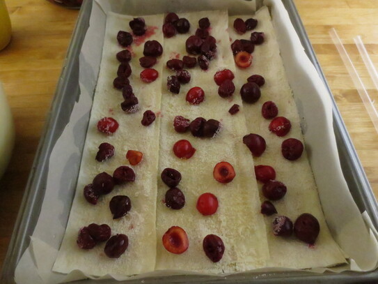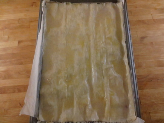 În tava tapetată se aşează primele trei foi. Fiecare foaie se unge separat cu ulei sau unt topit, apoi se aşează peste următoarea foaie de plăcintă. Peste a treia foaie se presară trei linguri de griş. Peste griş se pune o treime din vişinele curăţate apoi se adaugă un sfert din amestecul de ouă cu lapte. Se acoperă cu alte două foi de plăcintă şi se repetă operaţia, rezultând în final trei straturi de griş, vişine şi compoziţia de ouă cu lapte.