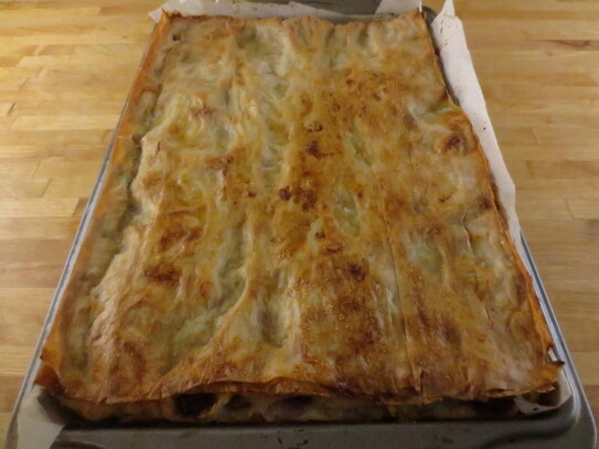 Când plăcinta s-a rumenit pe deasupra şi se desprinde uşor de pe marginile tăvii, se scoate din cuptor.
