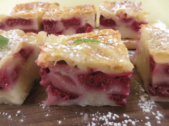 Este o plăcintă tradiţională ce se ne aduce aminte de banalul dar deliciosul griş cu lapte care ne-a răsfăţat copilăria. Se prepară destul de uşor, mai ales dacă se folosesc foi din comerţ. În locul vişinelor se pot folosi şi alte fructe de sezon.