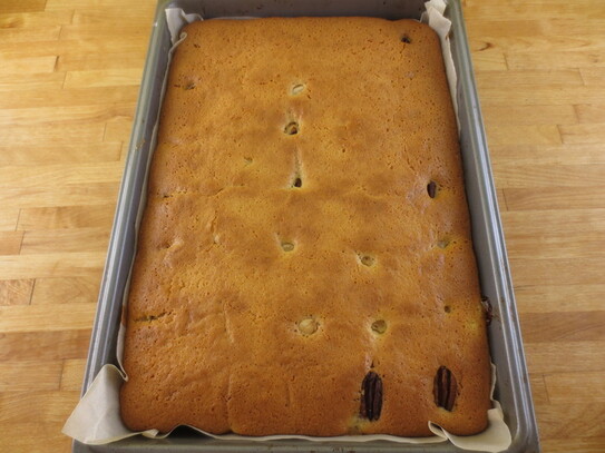 Plăcinta se lasă să se răcească, apoi se taie în formă de pătrăţele sau romburi şi se pudrează cu zahăr pudră.