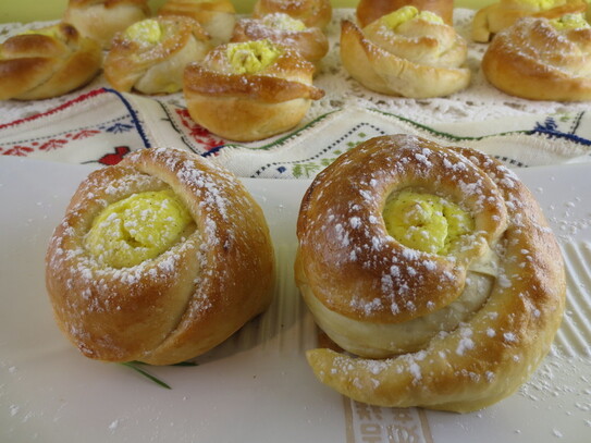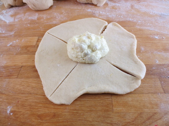 Pentru prepararea umpluturii, brânza de vaci se zdrobeşte mai întâi cu o furculiţă până ce devine ca o pastă, apoi se amestecă cu 4 linguri de zahăr, 2 ouă, vanilia, coaja rasă de la o lămâie, grişul şi stafidele (opţional). Umplutura se lasă să se odihnească la temperatura camerei, până când aluatul a dospit şi e gata pentru prepararea plăcintelor.