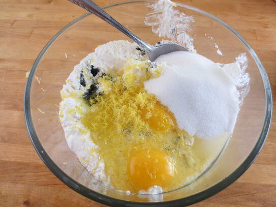 Se adaugă apoi 2 ouă, 4 linguri de zahăr, coaja rasă de lămâie, untul tăiat în cubuleţe mici, sarea şi vanilia. Se amestecă bine compoziţia în timp ce se toarnă laptele călduţ în fir subţire.