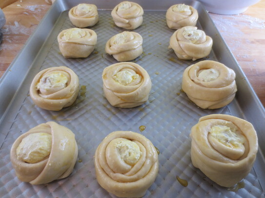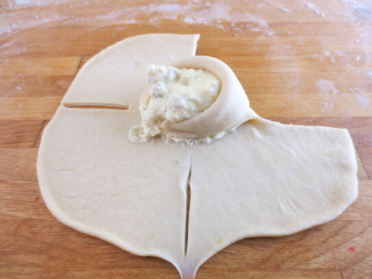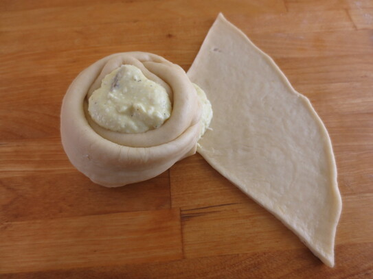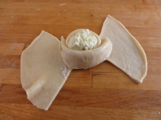 Fiecare bilă de aluat se întinde pe rând cu sucitorul până când foaia are grosimea de 3-4 mm. În mijlocul foii se pune o lingură din umplutură de brânză, apoi aluatul se crestează în patru, la un cm distanţă de umplutură. Pentru formarea trandafiraşilor, se ia o parte crestată, se pliază marginile şi se întinde în jurul umpluturii, lipind capetele şi formând astfel prima petală. Se pliază apoi partea opusă şi se repetă aceeaşi paşi. Se procedează la fel părţile rămase, având grijă ca ultima petală să se unească sub partea pliată a petalei opuse ( observaţi fotografiile pentru mai multe detalii).