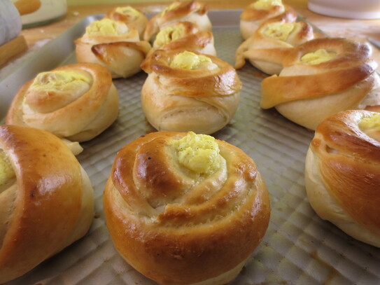 Plăcintele se aşează în tavă la cel puţin 4 cm distanţă una de cealaltă şi se ung cu ou bătut în care s-a adăugat un praf de sare.