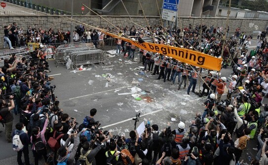 Sute de ofiţeri de poliţie înarmaţi cu ferăstraie şi cleşti mari au desfiinţat metodic baricadele, au înlăturat bannerele şi corturile. A fost o operaţiune desfăşurată pe durata întregii zile pentru a închide un loc de protest stabilit pe porţiunea unei autostrăzi, în mod normal aglomerată, situate în apropierea districtului financiar al Hong Kong-ului.