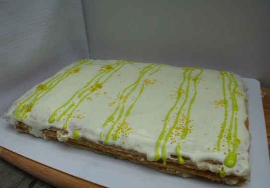 După ce foile s-au răcit, împărţim crema în 3 părţi egale şi o întindem uniform cele 3 foi care au fost unse în prealabil cu pasta de măceşe. La urmă punem a patra foaie, peste care se va turna glazura de albuş.