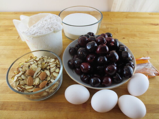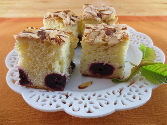 Prăjitura cu cireşe sau vişine este una dintre prăjiturile apreciate la reuniunile cu prietenii sau cu familia. Aroma cireşelor sau a vişinelor se combină perfect cu cea a migdalelor prăjite. Blatul iese moale şi pufos, fructele sunt zemoase, iar partea de deasupra este deosebit de crocantă.