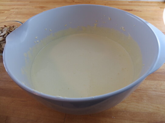 Se obţine o compoziţie omogenă care se toarnă într-o tavă tapetată cu hârtie de copt.