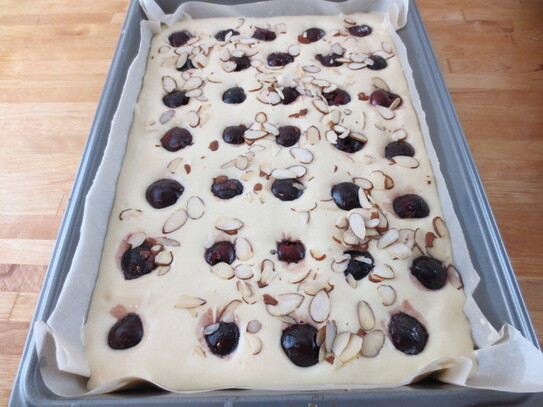 Deasupra blatului se aşează uniform cireşele sau vişinele fară sâmburi, după care se presară sâmburii raşi de migdale amestecaţi cu o lingură de zahăr.