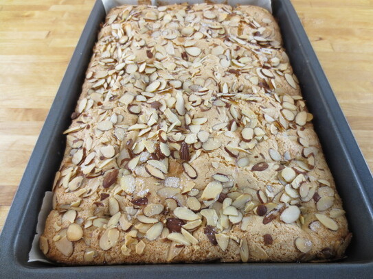 Prăjitura se scoate din cuptor şi se lasă 15 minute să se răcească, apoi se taie în bucăţi de dimensiunea şi forma dorită.
