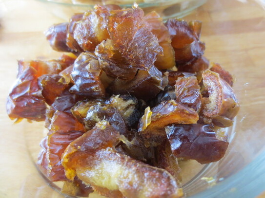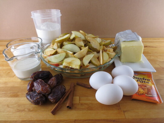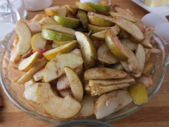 Se începe cu pregătirea fructelor. După îndepărtarea cotorului, merele se taie în felii subţiri, se dau prin zahăr şi scorţişoară şi apoi se lasă deoparte. Pentru decuparea cotorul se poate folosi un dispozitiv special pentru aceasta, iar în lipsa acestuia, se pot decupa feliile, crestând mărul de jur împrejur, până când se ajunge la cotor. Curmalele se taie în bucăţele.