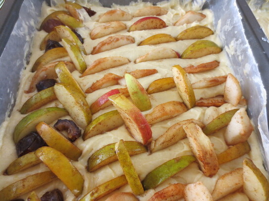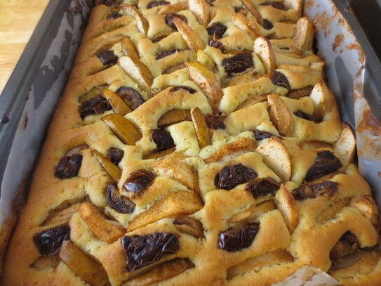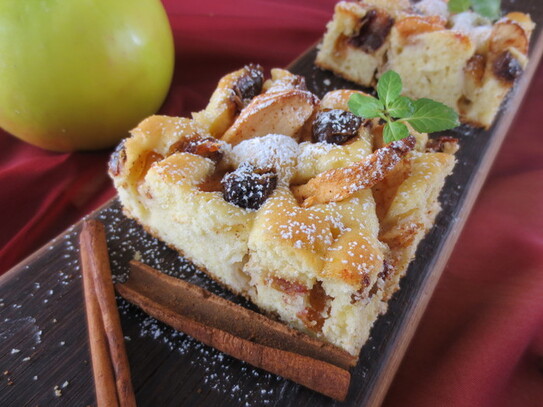 În mod special, plăcinta sau prăjitura cu mere şi miros de scorţişoară ne-a înseninat copilăria stârnind amintiri plăcute pentru mulţi dintre noi. Această reţetă de prăjitură, având aluatul puţin mai vârtos decât cel al pandişpanului, va ţine fructele deasupra dând astfel prăjiturii un aspect elegant. Merele şi curmalele se pot înlocui cu orice alt fruct de sezon: vişine, cireşe, prune, pere, struguri, etc.